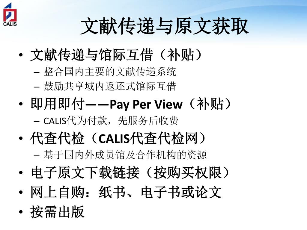 文献传递与原文获取 • 文献传递与馆际互借(补贴) • 整合国内主要的文献传递系统 • 鼓励共享域内返还式馆际互借 • 即用即付——Pay Per View(补贴) • CALIS代为付款,先服务后收费 • 代查代检(CALIS代查代检网) • 基于国内外成员馆及合作机构的资源 • 电子原文下载链接(按购买权限) • 网上自购:纸书、电子书或论文 • 按需出版