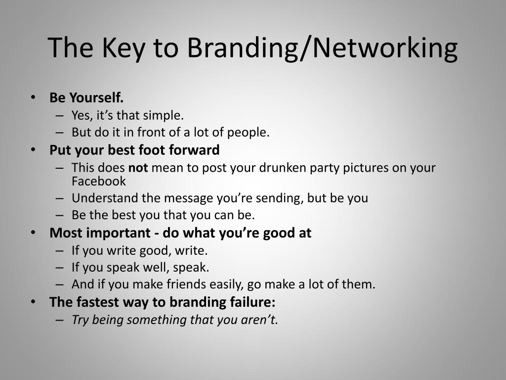 The Key to Branding/Networking • Be Yourself. • Yes, it’s that simple. • But do it in front of a lot of people. • Put your best foot forward • This does not mean to post your drunken party pictures on your Facebook • Understand the message you’re sending, but be you • Be the best you that you can be. • Most important - do what you’re good at • If you write good, write. • If you speak well, speak. • And if you make friends easily, go make a lot of them. • The fastest way to branding failure: • Try being something that you aren’t.