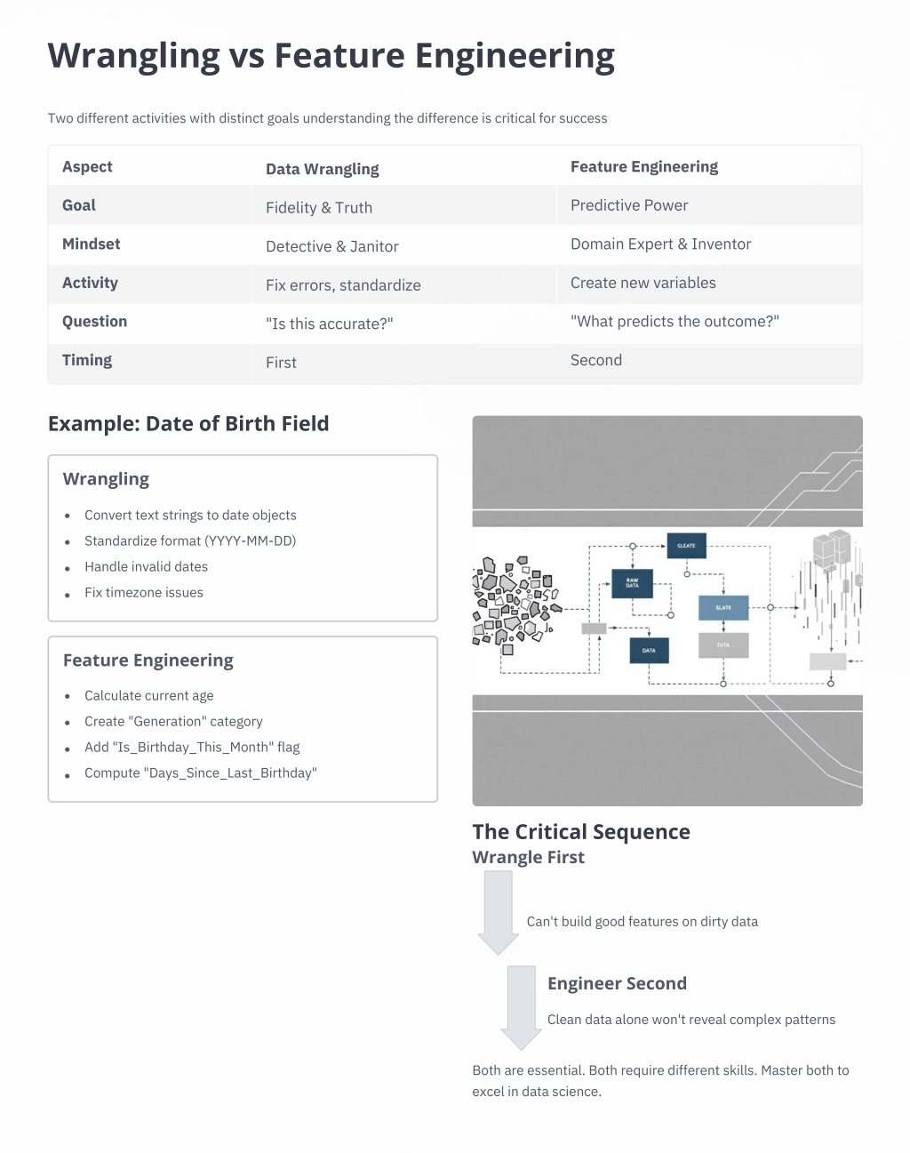 9. Wrangling vs Feature Engineering Twodifferentactivitieswithdistinctgoals understandingthedifferenceiscriticalforsuccess Aspect Feature Engineering Data Wrangling Goal Predictive Power Fidelity & Truth Mindset Domain Expert & Inventor Detective & Janitor Activity Create new variables Fix errors, standardize Question "What predicts the outcome?" "Is this accurate?" Timing Second First Example: Date of Birth Field Wrangling Convert text strings to date objects Standardize format (YYYY-MM-DD) Handle invalid dates Fix timezone issues Feature Engineering Calculate current age Create "Generation" category Add "Is_Birthday_This_Month" flag Compute "Days_Since_Last_Birthday" The Critical Sequence Wrangle First Can't build good features on dirty data Engineer Second Clean data alone won't reveal complex patterns Both are essential. Both require different skills. Master both to excel in data science.