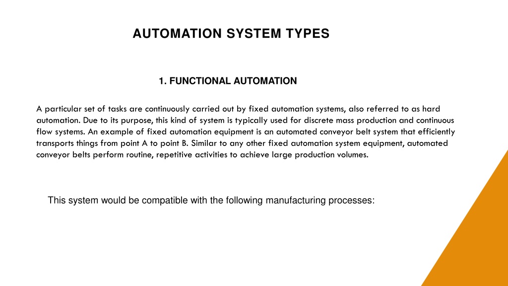 AAUTOMATION SYSTEM TYPES UTOMATION SYSTEM TYPES 1. FUNCTIONAL AUTOMATION A particular set of tasks are continuously carried out by fixed automation systems, also referred to as hard automation. Due to its purpose, this kind of system is typically used for discrete mass production and continuous flow systems. An example of fixed automation equipment is an automated conveyor belt system that efficiently transports things from point A to point B. Similar to any other fixed automation system equipment, automated conveyor belts perform routine, repetitive activities to achieve large production volumes. This system would be compatible with the following manufacturing processes: