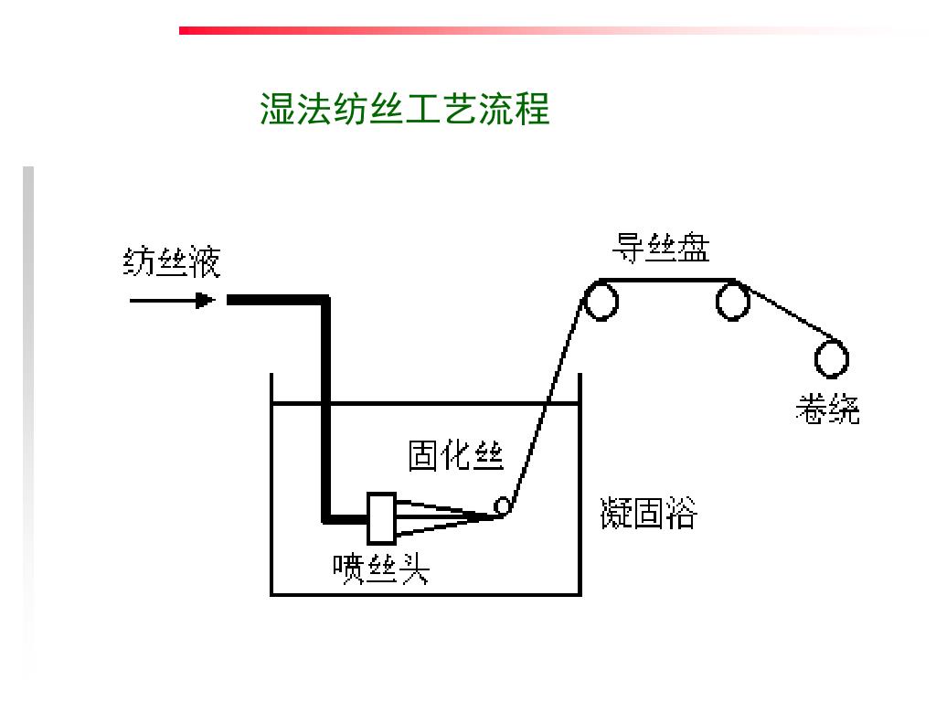 溶液纺丝法的纺丝液是溶解的高聚物溶液,纺出的丝的固化方式分为湿法与干法两种。溶液纺丝法的纺丝液是溶解的高聚物溶液,纺出的丝的固化方式分为湿法与干法两种。 2.湿法纺丝 • 湿法纺丝纺出的丝在溶液中固化 • 这种方法纺丝速度低,一般速度为18~380m/min。 • 湿法纺丝加工成本高且对环境污染较严重,纺出丝的截面多为非圆形,有皮芯结构。 • 腈纶、维纶、氯纶、粘胶纤维多采用此法。