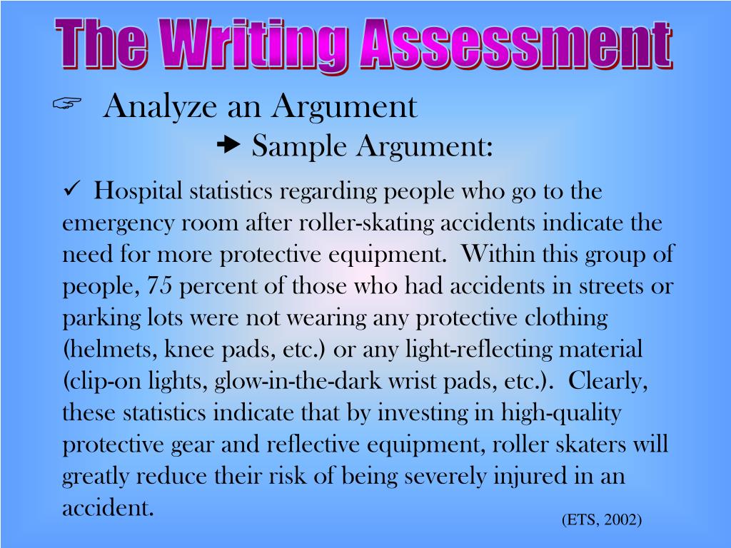 The Writing Assessment • Analyze an Argument Sample Argument: • Hospital statistics regarding people who go to the emergency room after roller-skating accidents indicate the need for more protective equipment. Within this group of people, 75 percent of those who had accidents in streets or parking lots were not wearing any protective clothing (helmets, knee pads, etc.) or any light-reflecting material (clip-on lights, glow-in-the-dark wrist pads, etc.). Clearly, these statistics indicate that by investing in high-quality protective gear and reflective equipment, roller skaters will greatly reduce their risk of being severely injured in an accident. (ETS, 2002)