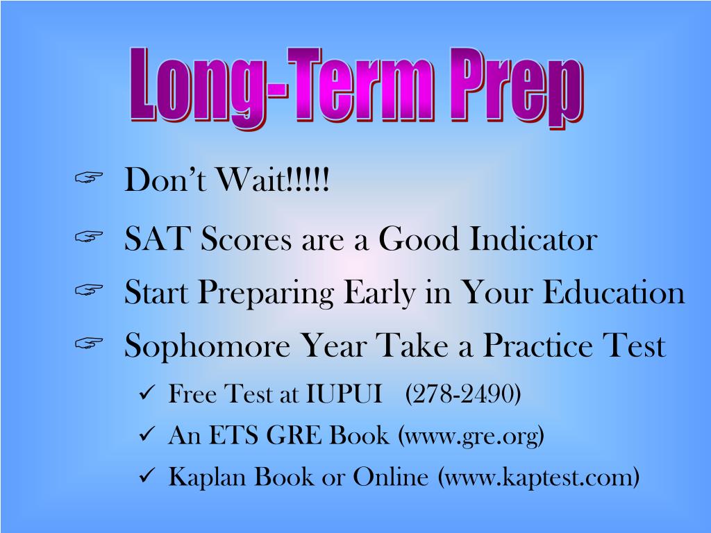 Long-Term Prep • Don’t Wait!!!!! • SAT Scores are a Good Indicator • Start Preparing Early in Your Education • Sophomore Year Take a Practice Test • Free Test at IUPUI (278-2490) • An ETS GRE Book (www.gre.org) • Kaplan Book or Online (www.kaptest.com)