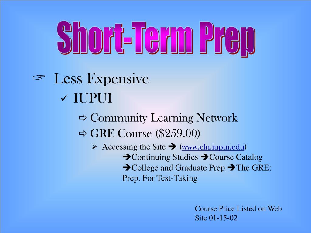 Short-Term Prep • Less Expensive • IUPUI • Community Learning Network • GRE Course ($259.00) • Accessing the Site (www.cln.iupui.edu) Continuing Studies Course Catalog College and Graduate Prep The GRE: Prep. For Test-Taking Course Price Listed on Web Site 01-15-02
