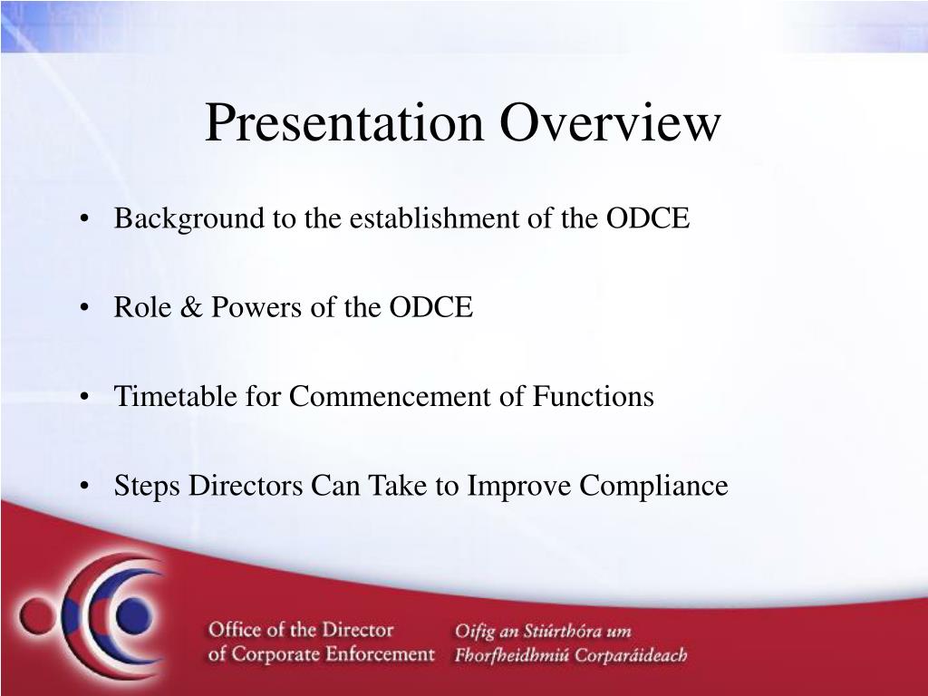 Presentation Overview • Background to the establishment of the ODCE • Role & Powers of the ODCE • Timetable for Commencement of Functions • Steps Directors Can Take to Improve Compliance
