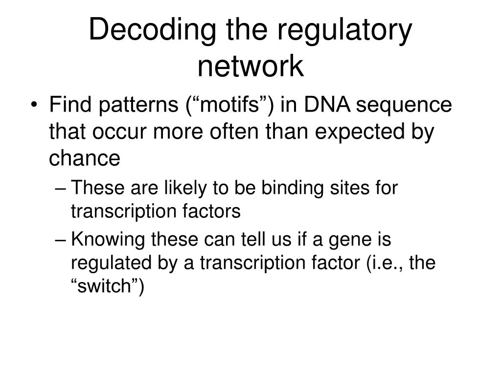 Decoding the regulatory network • Find patterns (“motifs”) in DNA sequence that occur more often than expected by chance • These are likely to be binding sites for transcription factors • Knowing these can tell us if a gene is regulated by a transcription factor (i.e., the “switch”)