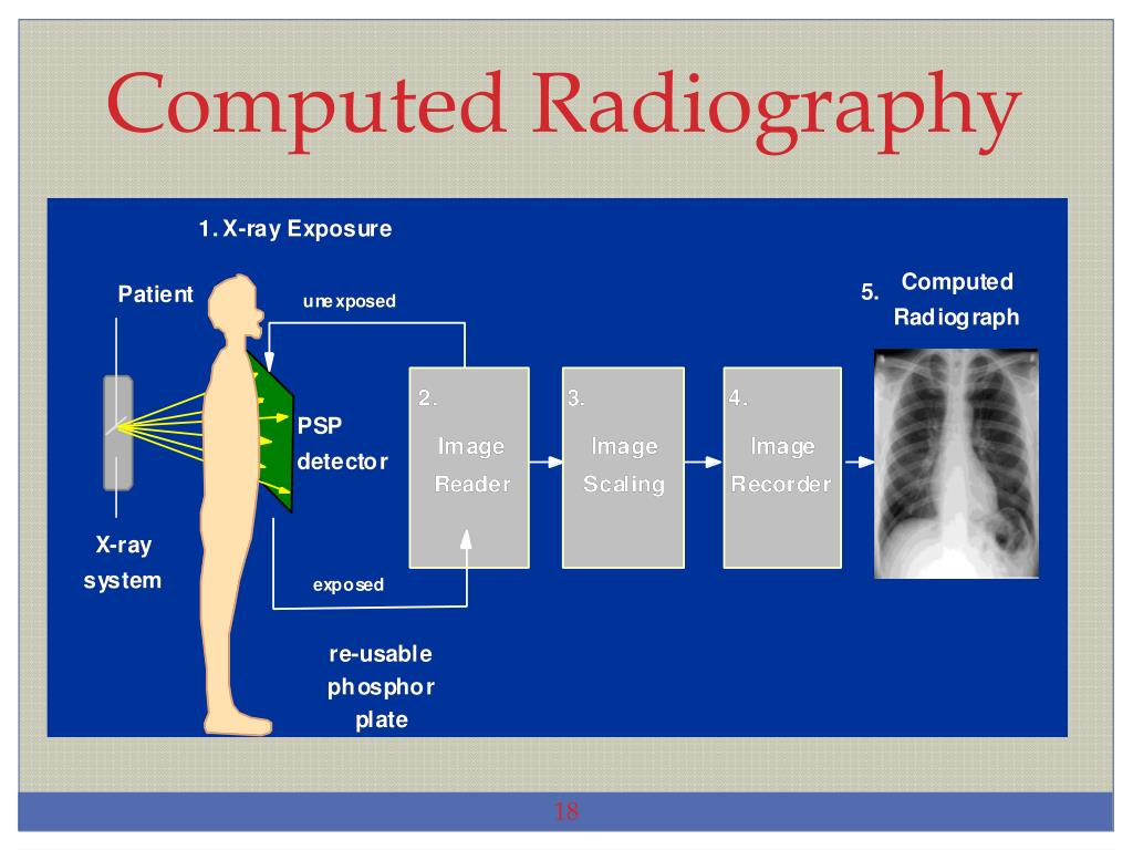 IMAGE PROCESSING • PSP plate exposed to radiation • Electrons are trapped in phosphor layer • Plate is exposed to a red laser light • As electrons are released, a blue light is emitted • Blue light is captured and recorded by PMT • Image is sent to monitor for display • PSP plate is exposed to intense white light for erasure