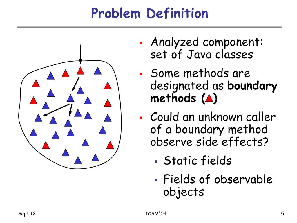 Problem Definition • Analyzed component: set of Java classes • Some methods are designated as boundarymethods ( ) • Could an unknown caller of a boundary method observe side effects? • Static fields • Fields of observable objects ICSM'04