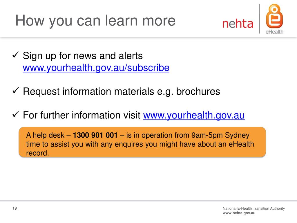 How you can learn more • Sign up for news and alerts www.yourhealth.gov.au/subscribe • Request information materials e.g. brochures • For further information visit www.yourhealth.gov.au A help desk – 1300 901 001 – is in operation from 9am-5pm Sydney time to assist you with any enquires you might have about an eHealthrecord.