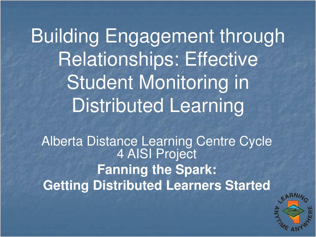 Building Engagement through Relationships: Effective Student Monitoring in Distributed Learning Alberta Distance Learning Centre Cycle 4 AISI Project Fanning the Spark: Getting Distributed Learners Started