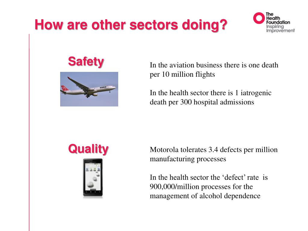 How are other sectors doing? Safety In the aviation business there is one death per 10 million flights In the health sector there is 1 iatrogenic death per 300 hospital admissions Quality Motorola tolerates 3.4 defects per million manufacturing processes In the health sector the ‘defect’ rate is 900,000/million processes for the management of alcohol dependence