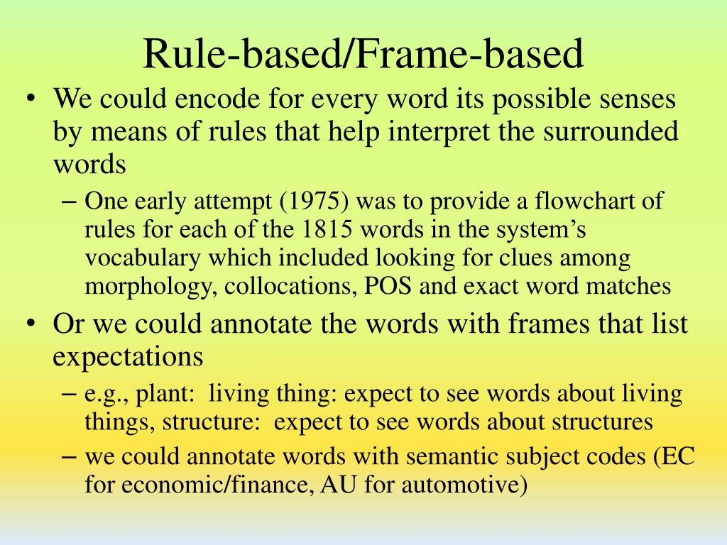 Rule-based/Frame-based • We could encode for every word its possible senses by means of rules that help interpret the surrounded words • One early attempt (1975) was to provide a flowchart of rules for each of the 1815 words in the system’s vocabulary which included looking for clues among morphology, collocations, POS and exact word matches • Or we could annotate the words with frames that list expectations • e.g., plant: living thing: expect to see words about living things, structure: expect to see words about structures • we could annotate words with semantic subject codes (EC for economic/finance, AU for automotive)