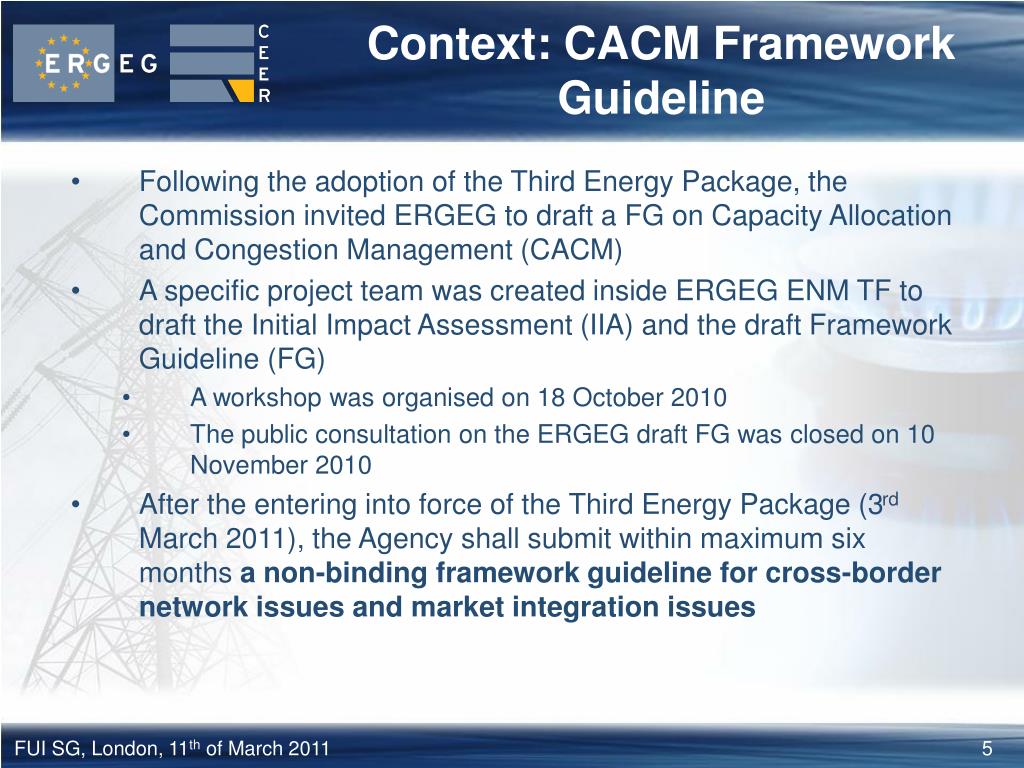Context: CACM Framework Guideline • Following the adoption of the Third Energy Package, the Commission invited ERGEG to draft a FG on Capacity Allocation and Congestion Management (CACM) • A specific project team was created inside ERGEG ENM TF to draft the Initial Impact Assessment (IIA) and the draft Framework Guideline (FG) • A workshop was organised on 18 October 2010 • The public consultation on the ERGEG draft FG was closed on 10 November 2010 • After the entering into force of the Third Energy Package (3rd March 2011), the Agency shall submit within maximum six months a non-binding framework guideline for cross-border network issues and market integration issues