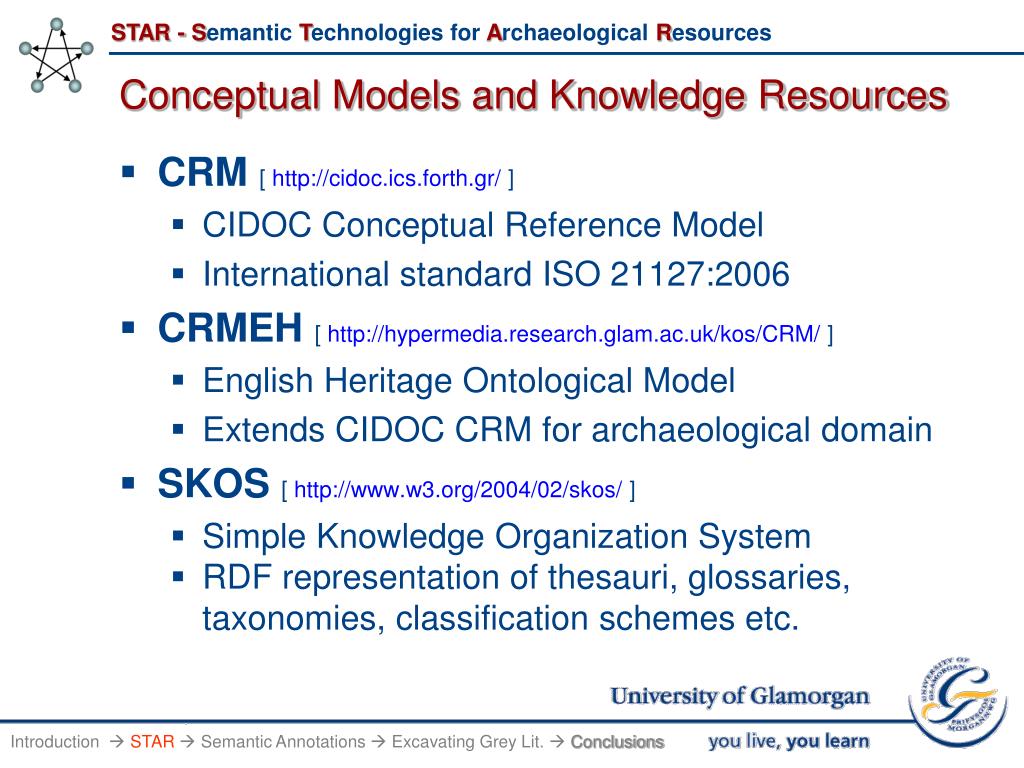 Conceptual Models and Knowledge Resources • CRM[ http://cidoc.ics.forth.gr/ ] • CIDOC Conceptual Reference Model • International standard ISO 21127:2006 • CRMEH[ http://hypermedia.research.glam.ac.uk/kos/CRM/ ] • English Heritage Ontological Model • Extends CIDOC CRM for archaeological domain • SKOS[ http://www.w3.org/2004/02/skos/ ] • Simple Knowledge Organization System • RDF representation of thesauri, glossaries, taxonomies, classification schemes etc. Introduction STAR Semantic Annotations Excavating Grey Lit. Conclusions