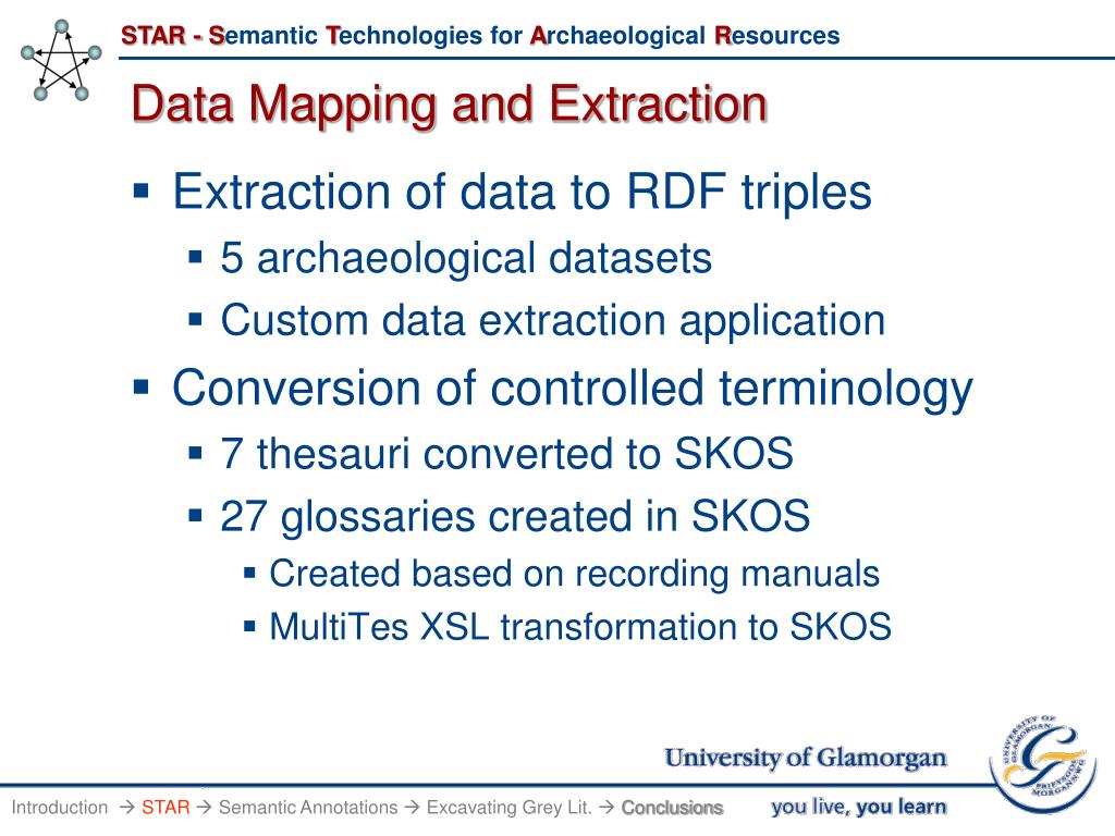 Data Mapping and Extraction • Extraction of data to RDF triples • 5 archaeological datasets • Custom data extraction application • Conversion of controlled terminology • 7 thesauri converted to SKOS • 27 glossaries created in SKOS • Created based on recording manuals • MultiTes XSL transformation to SKOS Introduction STAR Semantic Annotations Excavating Grey Lit. Conclusions
