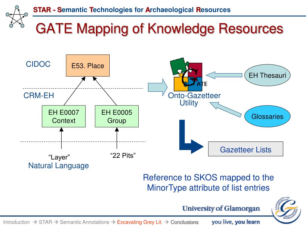 GATE Mapping of Knowledge Resources E53. Place CIDOC EH Thesauri CRM-EH Onto-GazetteerUtility EH E0007Context EH E0005Group Glossaries Gazetteer Lists “22 Pits” “Layer” Natural Language Reference to SKOS mapped to the MinorType attribute of list entries Introduction STAR Semantic Annotations Excavating Grey Lit. Conclusions