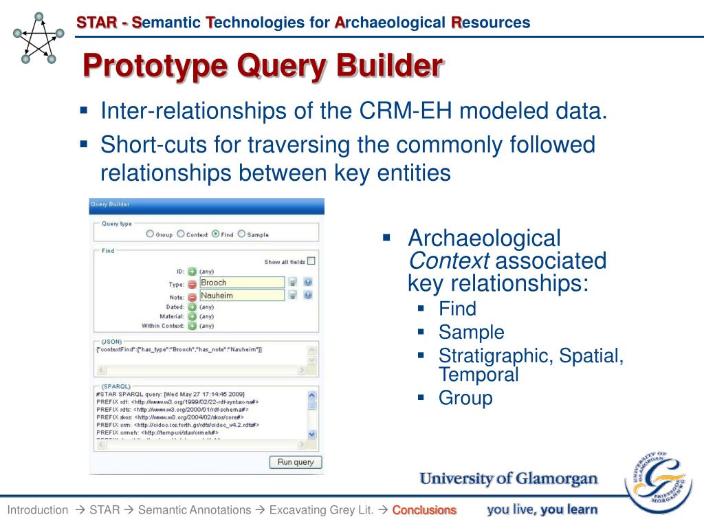 Prototype Query Builder • Inter-relationships of the CRM-EH modeled data. • Short-cuts for traversing the commonly followed relationships between key entities • Archaeological Context associated key relationships: • Find • Sample • Stratigraphic, Spatial, Temporal • Group Introduction STAR Semantic Annotations Excavating Grey Lit. Conclusions