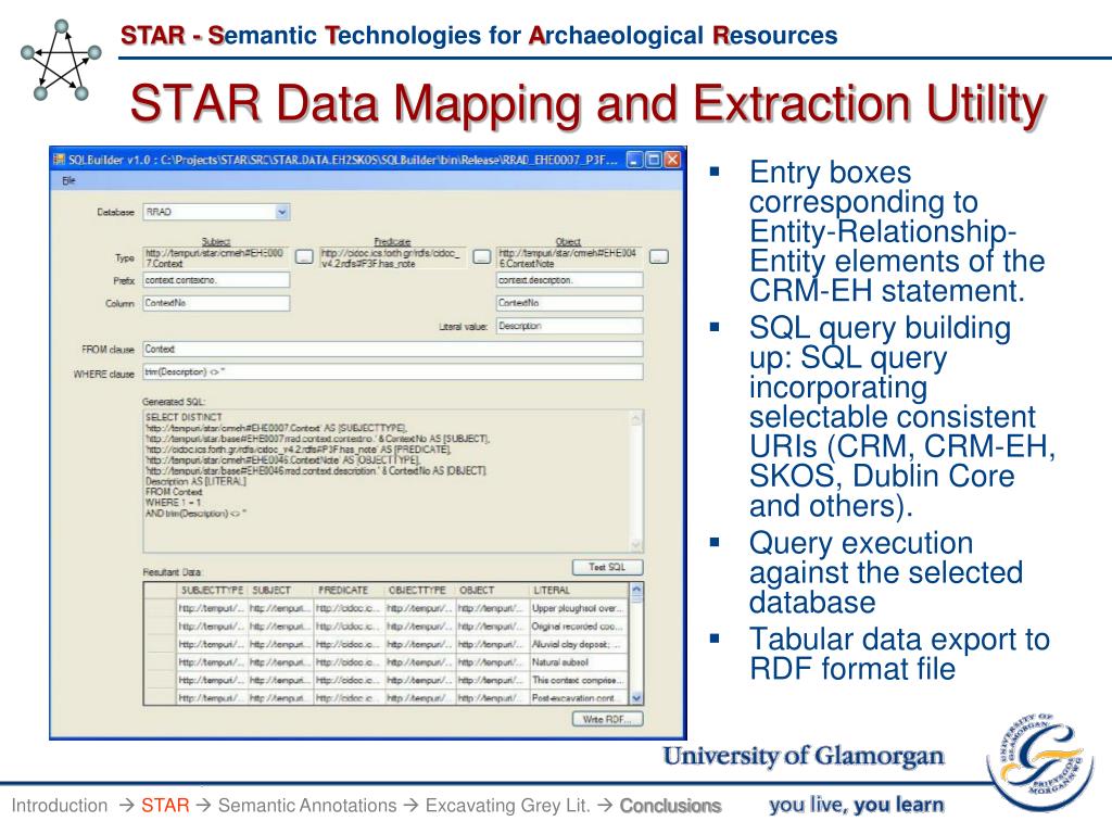 Applications and Utilities • Data Mapping and Extraction Utility • Bespoke mapping/extraction utility • Extract archaeological data conforming to mapping • Semi-automated manner • Prototype CRM Browser • Prototype CRM browser • Query entry of free-text search terms • Option to navigate the results of returned queries. Introduction STAR Semantic Annotations Excavating Grey Lit. Conclusions
