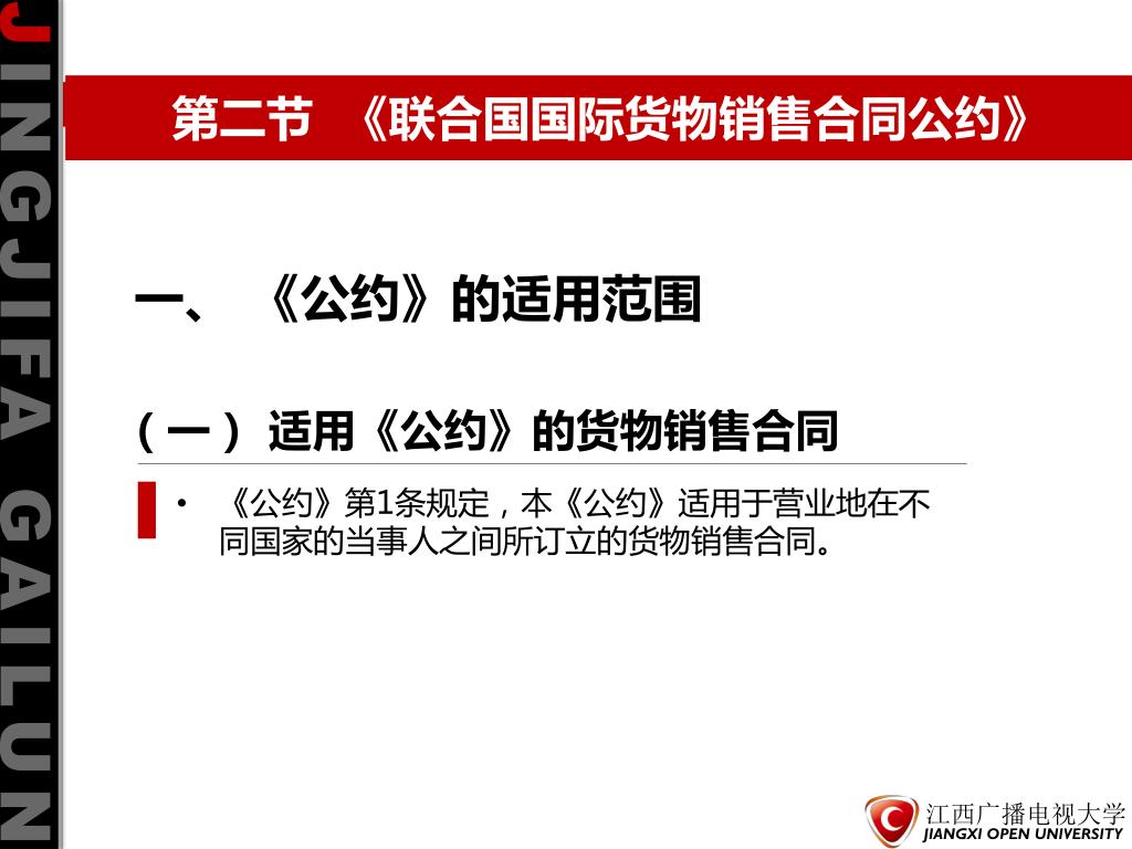 第二节 《联合国国际货物销售合同公约》 一、 《公约》的适用范围 (一) 适用《公约》的货物销售合同 • 《公约》第1条规定,本《公约》适用于营业地在不同国家的当事人之间所订立的货物销售合同。