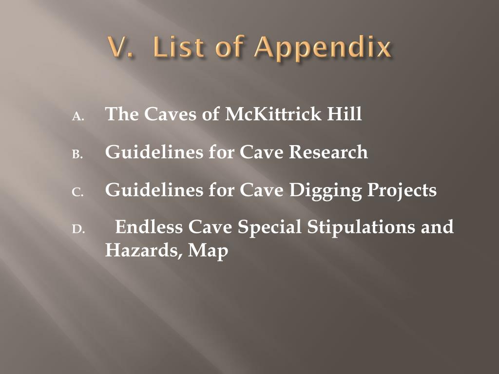 V. List of Appendix • The Caves of McKittrick Hill • Guidelines for Cave Research • Guidelines for Cave Digging Projects • Endless Cave Special Stipulations and Hazards, Map