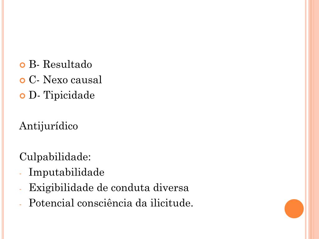 B- Resultado • C- Nexo causal • D- Tipicidade Antijurídico Culpabilidade: • Imputabilidade • Exigibilidade de conduta diversa • Potencial consciência da ilicitude.