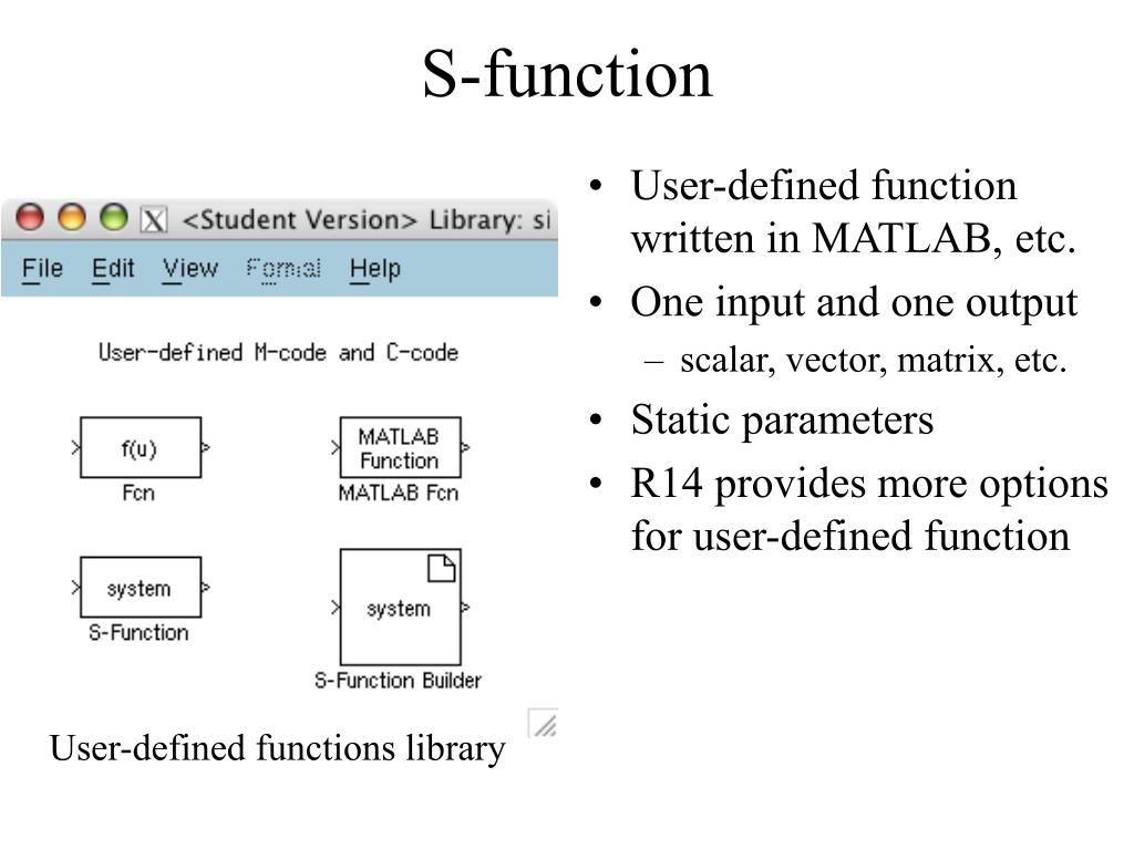 S-function • User-defined function written in MATLAB, etc. • One input and one output • scalar, vector, matrix, etc. • Static parameters • R14 provides more options for user-defined function User-defined functions library