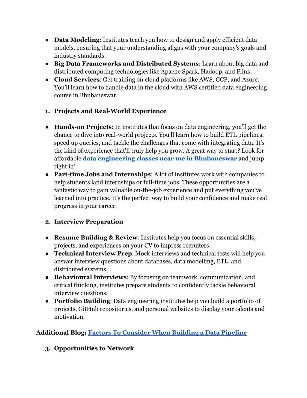 2. ● Data Modeling: Institutes teach you how to design and apply efficient data models, ensuring that your understanding aligns with your company's goals and industry standards. ● Big Data Frameworks and Distributed Systems: Learn about big data and distributed computing technologies like Apache Spark, Hadoop, and Flink. ● Cloud Services: Get training on cloud platforms like AWS, GCP, and Azure. You’ll learn how to handle data in the cloud with AWS certified data engineering course in Bhubaneswar. 1.Projects and Real-World Experience ● Hands-on Projects: In institutes that focus on data engineering, you’ll get the chance to dive into real-world projects. You'll learn how to build ETL pipelines, speed up queries, and tackle the challenges that come with integrating data. It’s the kind of experience that’ll truly help you grow. A great way to start? Look for affordable data engineering classes near me in Bhubaneswar and jump right in! ● Part-time Jobs and Internships: A lot of institutes work with companies to help students land internships or full-time jobs. These opportunities are a fantastic way to gain valuable on-the-job experience and put everything you've learned into practice. It’s the perfect way to build your confidence and make real progress in your career. 2.Interview Preparation ● Resume Building & Review: Institutes help you focus on essential skills, projects, and experiences on your CV to impress recruiters. ● Technical Interview Prep: Mock interviews and technical tests will help you answer interview questions about databases, data modelling, ETL, and distributed systems. ● Behavioural Interviews: By focusing on teamwork, communication, and critical thinking, institutes prepare students to confidently tackle behavioral interview questions. ● Portfolio Building: Data engineering institutes help you build a portfolio of projects, GitHub repositories, and personal websites to display your talents and motivation. Additional Blog: Factors To Consider When Building a Data Pipeline 3.Opportunities to Network