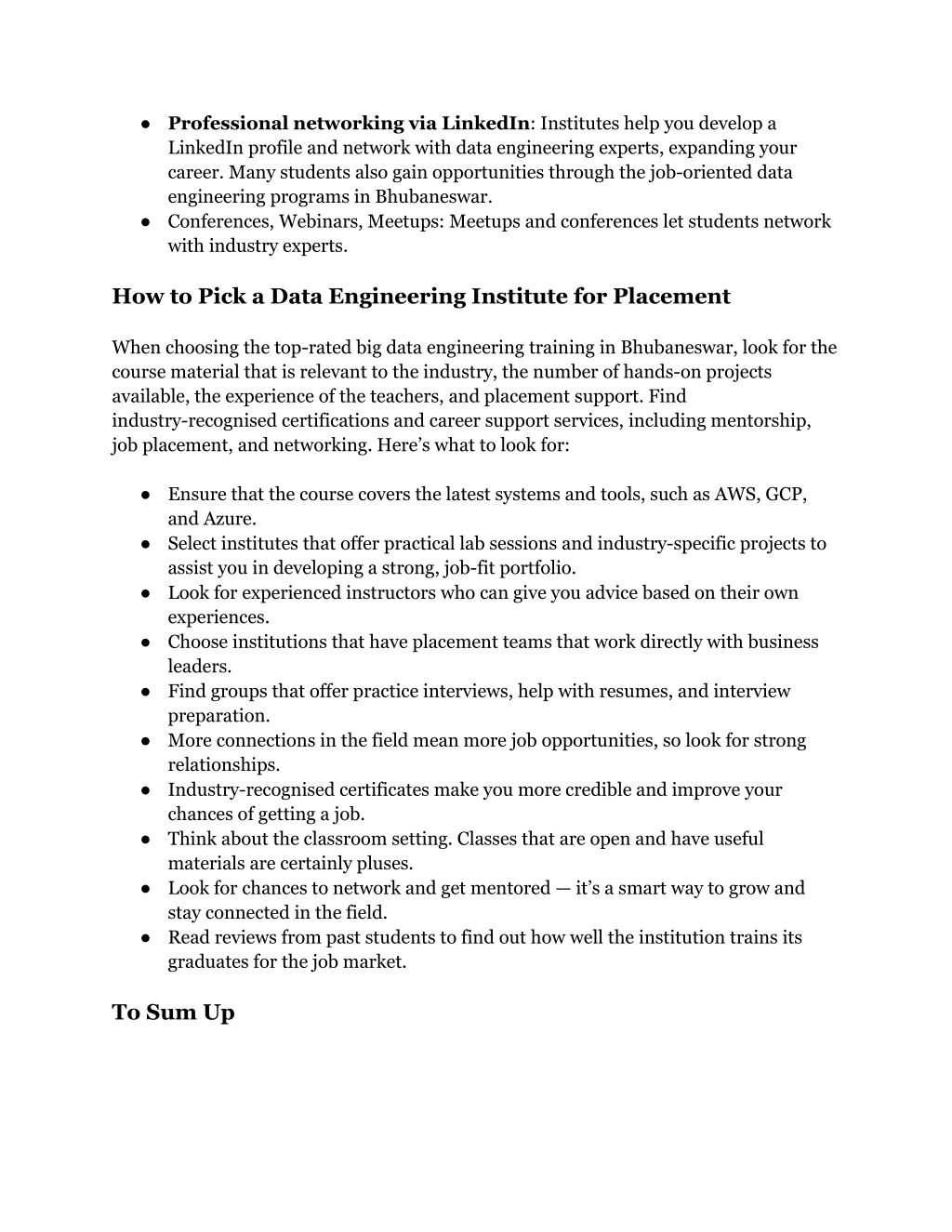 3. ● Professional networking via LinkedIn: Institutes help you develop a LinkedIn profile and network with data engineering experts, expanding your career. Many students also gain opportunities through the job-oriented data engineering programs in Bhubaneswar. ● Conferences, Webinars, Meetups: Meetups and conferences let students network with industry experts. How to Pick a Data Engineering Institute for Placement When choosing the top-rated big data engineering training in Bhubaneswar, look for the course material that is relevant to the industry, the number of hands-on projects available, the experience of the teachers, and placement support. Find industry-recognised certifications and career support services, including mentorship, job placement, and networking. Here’s what to look for: ● Ensure that the course covers the latest systems and tools, such as AWS, GCP, and Azure. ● Select institutes that offer practical lab sessions and industry-specific projects to assist you in developing a strong, job-fit portfolio. ● Look for experienced instructors who can give you advice based on their own experiences. ● Choose institutions that have placement teams that work directly with business leaders. ● Find groups that offer practice interviews, help with resumes, and interview preparation. ● More connections in the field mean more job opportunities, so look for strong relationships. ● Industry-recognised certificates make you more credible and improve your chances of getting a job. ● Think about the classroom setting. Classes that are open and have useful materials are certainly pluses. ● Look for chances to network and get mentored — it’s a smart way to grow and stay connected in the field. ● Read reviews from past students to find out how well the institution trains its graduates for the job market. To Sum Up