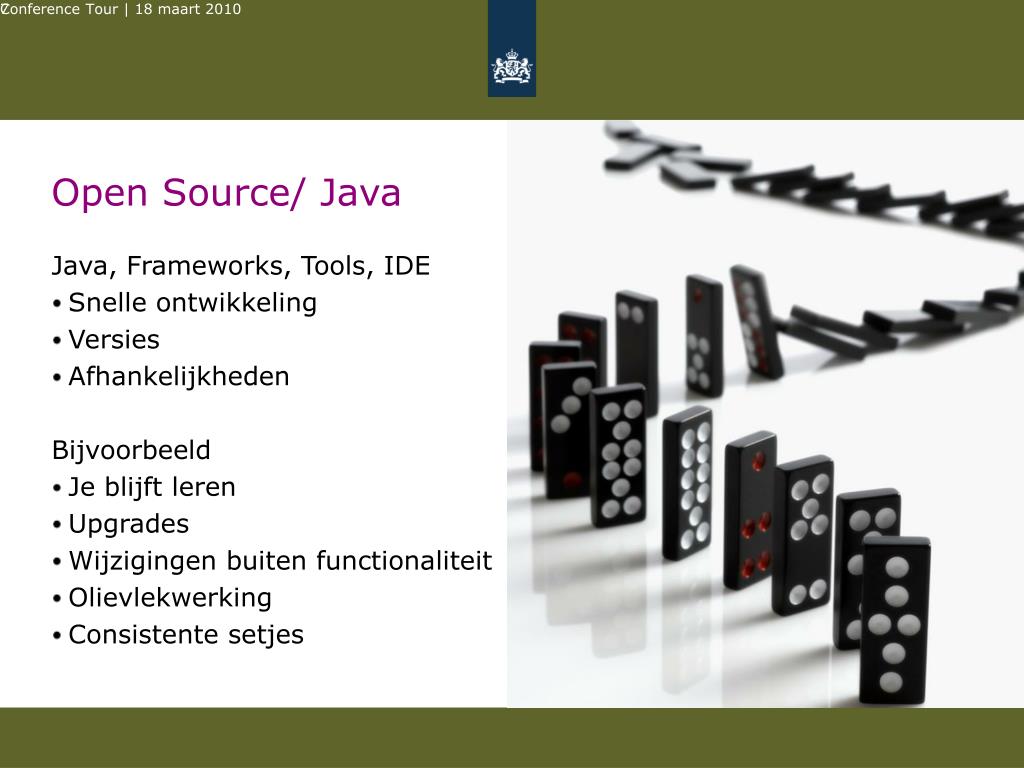 Open Source/ Java Java, Frameworks, Tools, IDE Snelle ontwikkeling Versies Afhankelijkheden Bijvoorbeeld Je blijft leren Upgrades Wijzigingen buiten functionaliteit Olievlekwerking Consistente setjes