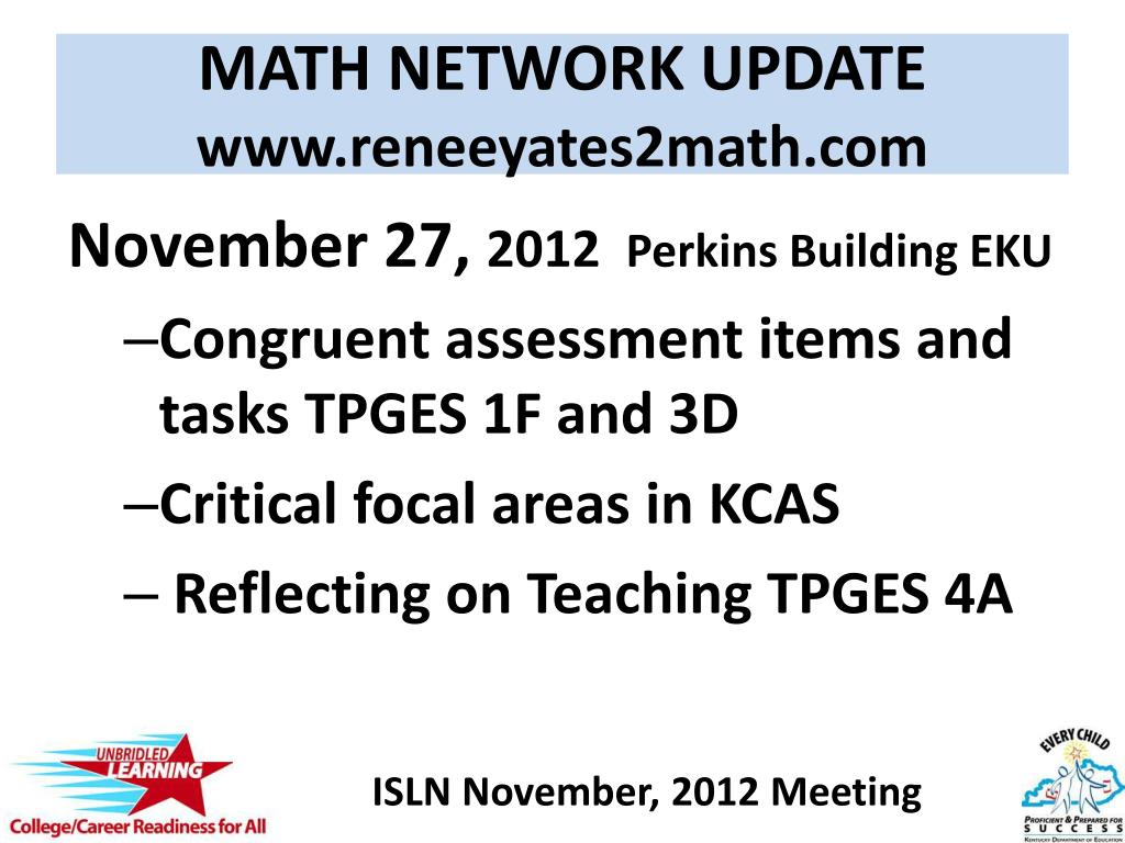 MATH NETWORK UPDATEwww.reneeyates2math.com November 27, 2012 Perkins Building EKU • Congruent assessment items and tasks TPGES 1F and 3D • Critical focal areas in KCAS • Reflecting on Teaching TPGES 4A