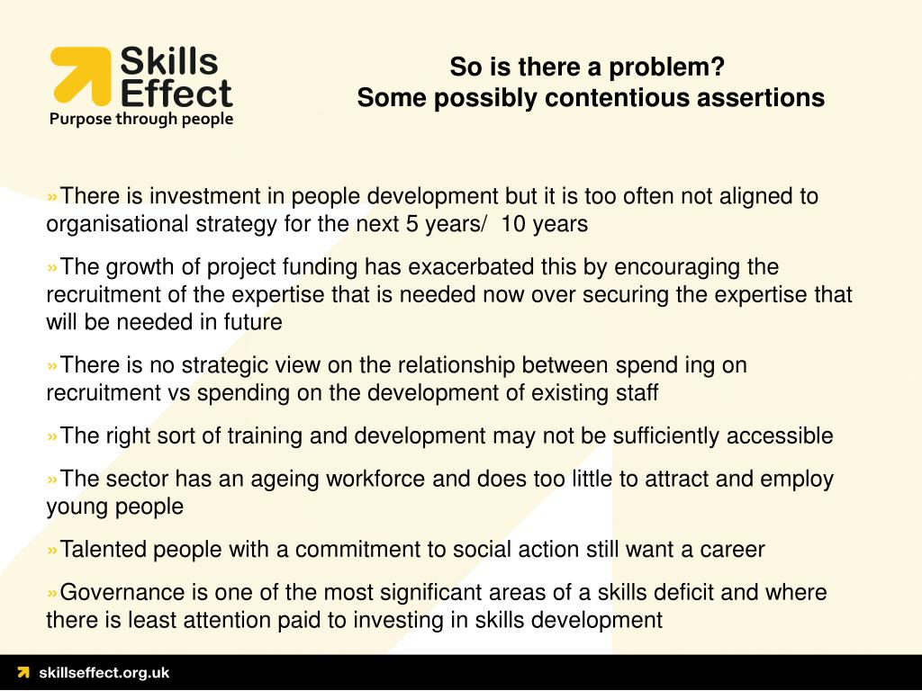 So is there a problem? Some possibly contentious assertions There is investment in people development but it is too often not aligned to organisational strategy for the next 5 years/ 10 years The growth of project funding has exacerbated this by encouraging the recruitment of the expertise that is needed now over securing the expertise that will be needed in future There is no strategic view on the relationship between spend ing on recruitment vs spending on the development of existing staff The right sort of training and development may not be sufficiently accessible The sector has an ageing workforce and does too little to attract and employ young people Talented people with a commitment to social action still want a career Governance is one of the most significant areas of a skills deficit and where there is least attention paid to investing in skills development