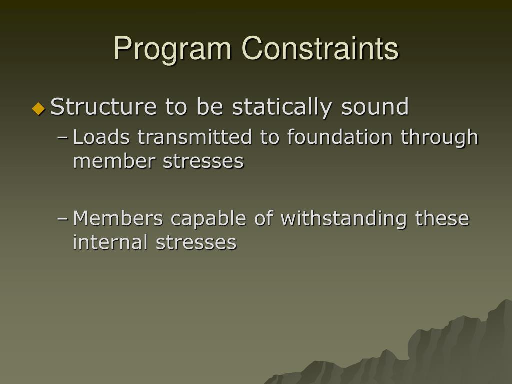 Program Constraints • Structure to be statically sound • Loads transmitted to foundation through member stresses • Members capable of withstanding these internal stresses