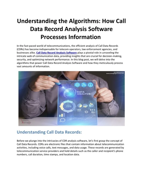 Understanding the Algorithms: How Call Data Record Analysis Software Processes Information In the fast-paced world of telecommunications, the efficient analysis of Call Data Records (CDRs) has become indispensable for telecom operators, law enforcement agencies, and businesses alike. Call Data Record Analysis Software plays a pivotal role in unraveling the intricate web of communication data, providing insights that are crucial for decision-making, security, and optimizing network performance. In this blog post, we will delve into the algorithms that power Call Data Record Analysis Software and how they meticulously process vast amounts of information. Understanding Call Data Records: Before we plunge into the intricacies of CDR analysis software, let's first grasp the concept of Call Data Records. CDRs are electronic files that contain information about telecommunication activities, including voice calls, text messages, and data usage. These records are generated by telecommunication service providers and hold details such as the caller and recipient's phone numbers, call duration, time stamps, and location data.