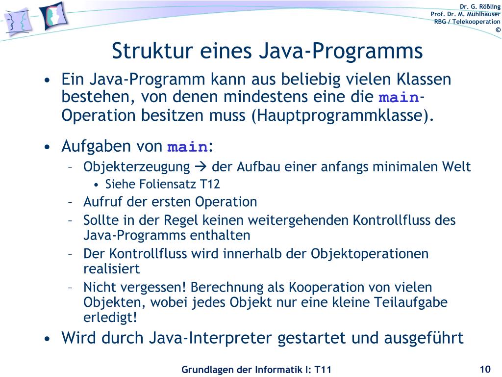 Struktur eines Java-Programms • Ein Java-Programm kann aus beliebig vielen Klassen bestehen, von denen mindestens eine die main-Operation besitzen muss (Hauptprogrammklasse). • Aufgaben von main: • Objekterzeugung der Aufbau einer anfangs minimalen Welt • Siehe Foliensatz T12 • Aufruf der ersten Operation • Sollte in der Regel keinen weitergehenden Kontrollfluss des Java-Programms enthalten • Der Kontrollfluss wird innerhalb der Objektoperationen realisiert • Nicht vergessen! Berechnung als Kooperation von vielen Objekten, wobei jedes Objekt nur eine kleine Teilaufgabe erledigt! • Wird durch Java-Interpreter gestartet und ausgeführt