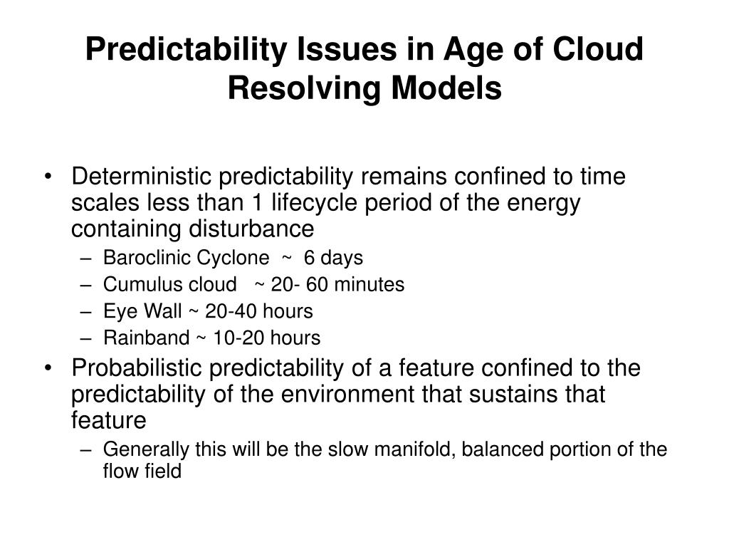 Predictability Issues in Age of Cloud Resolving Models • Deterministic predictability remains confined to time scales less than 1 lifecycle period of the energy containing disturbance • Baroclinic Cyclone ~ 6 days • Cumulus cloud ~ 20- 60 minutes • Eye Wall ~ 20-40 hours • Rainband ~ 10-20 hours • Probabilistic predictability of a feature confined to the predictability of the environment that sustains that feature • Generally this will be the slow manifold, balanced portion of the flow field
