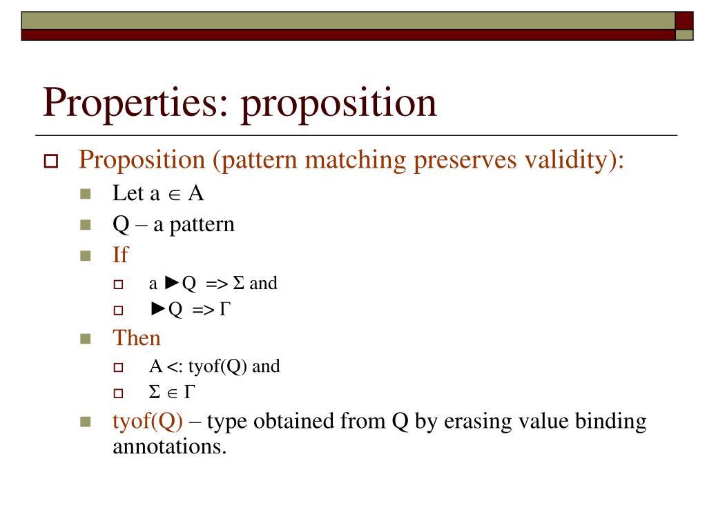 Properties: proposition • Proposition(pattern matching preserves validity): • Let a A • Q – a pattern • If • a ►Q => Σ and • ►Q => Γ • Then • A <: tyof(Q) and • Σ Γ • tyof(Q) – type obtained from Q by erasing value binding annotations.