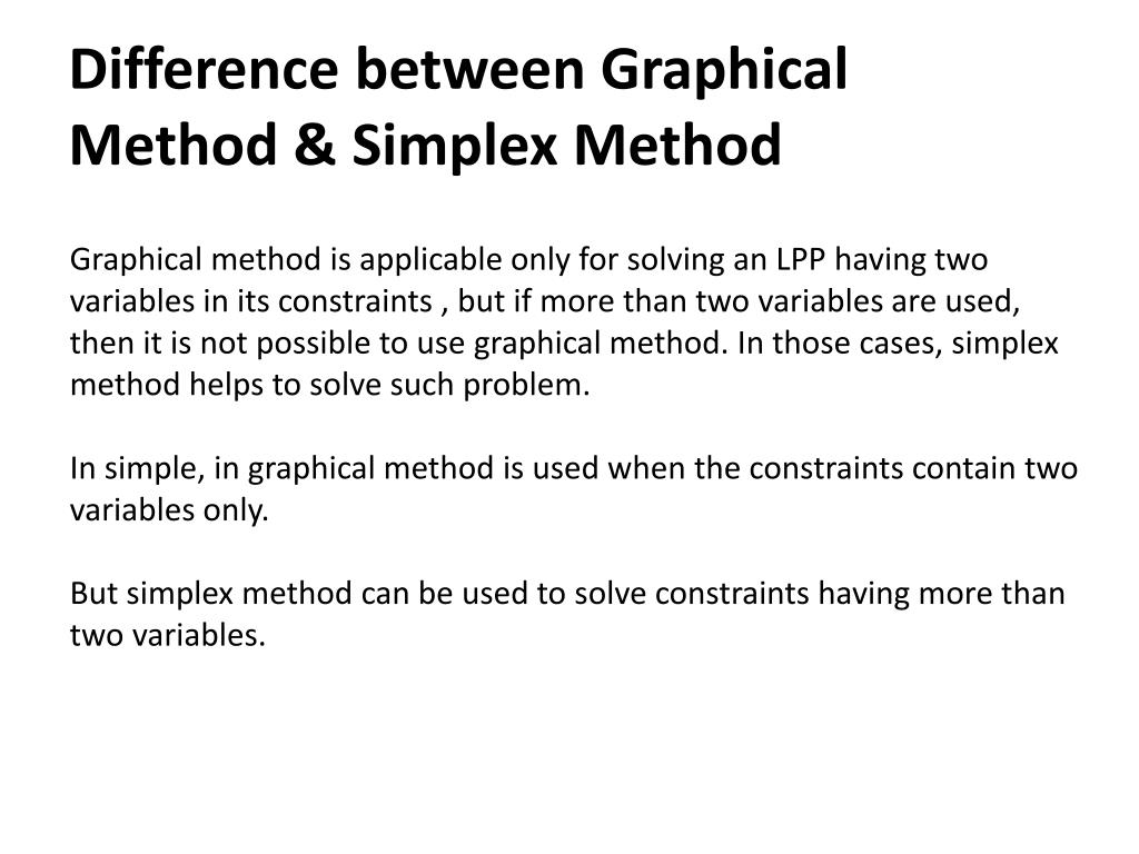 Difference between Graphical Method & Simplex Method Graphical method is applicable only for solving an LPP having two variables in its constraints , but if more than two variables are used, then it is not possible to use graphical method. In those cases, simplex method helps to solve such problem. In simple, in graphical method is used when the constraints contain two variables only. But simplex method can be used to solve constraints having more than two variables.
