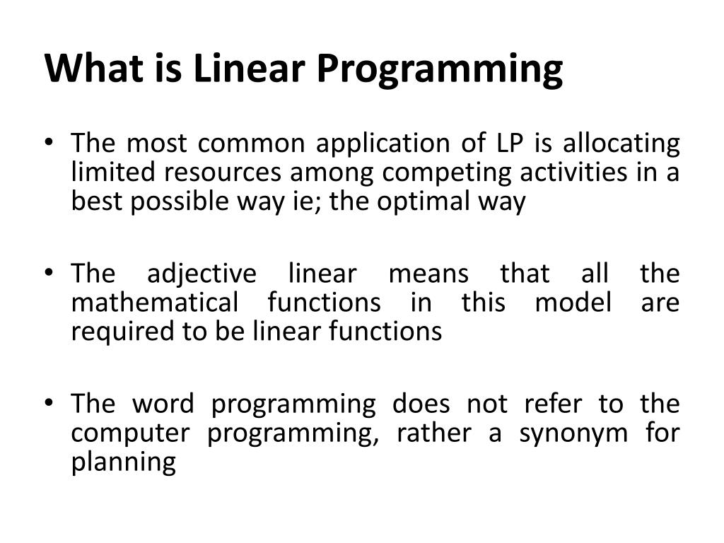 What is Linear Programming • The most common application of LP is allocating limited resources among competing activities in a best possible way ie; the optimal way • The adjective linear means that all the mathematical functions in this model are required to be linear functions • The word programming does not refer to the computer programming, rather a synonym for planning