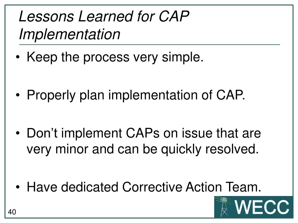 Lessons Learned for CAP Implementation • Keep the process very simple. • Properly plan implementation of CAP. • Don’t implement CAPs on issue that are very minor and can be quickly resolved. • Have dedicated Corrective Action Team.