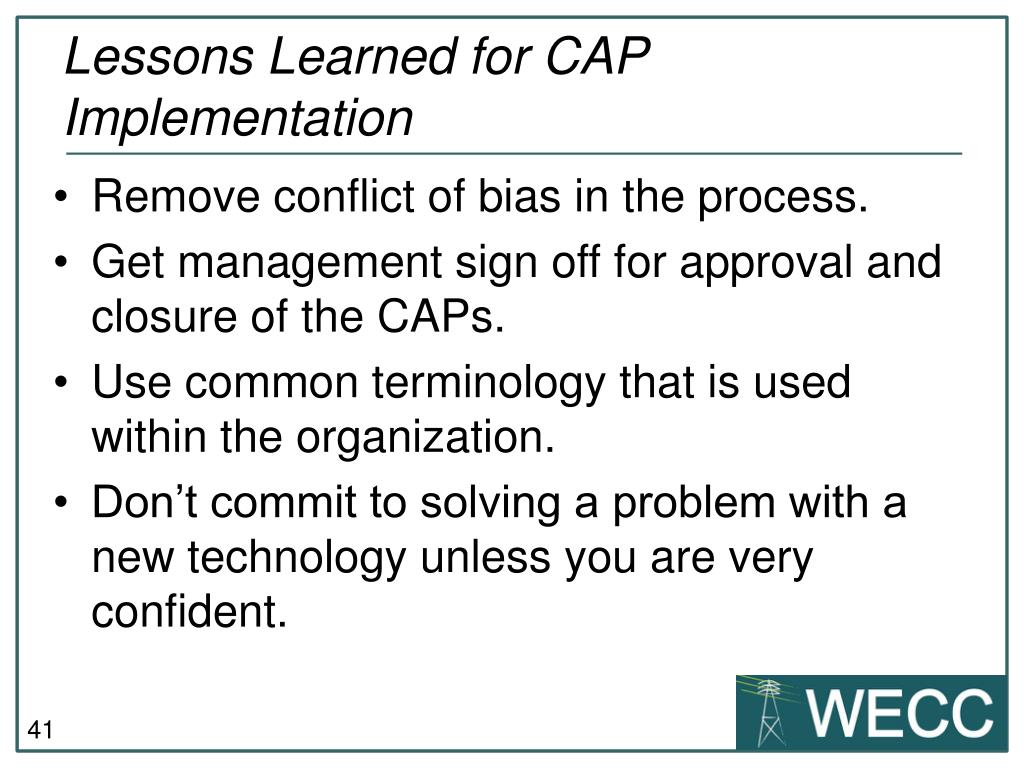 Lessons Learned for CAP Implementation • Remove conflict of bias in the process. • Get management sign off for approval and closure of the CAPs. • Use common terminology that is used within the organization. • Don’t commit to solving a problem with a new technology unless you are very confident.