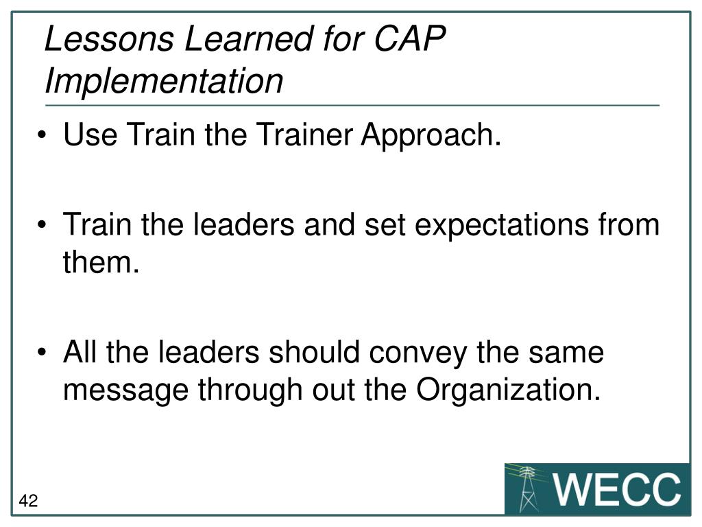 Lessons Learned for CAP Implementation • Use Train the Trainer Approach. • Train the leaders and set expectations from them. • All the leaders should convey the same message through out the Organization.