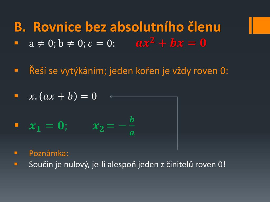 B. Rovnice bez absolutního členu • Řeší se vytýkáním; jeden kořen je vždy roven 0: • Poznámka: • Součin je nulový, je-li alespoň jeden z činitelů roven 0!