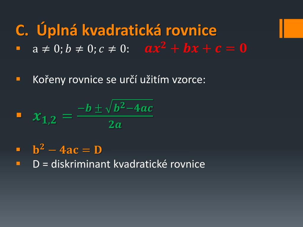 C. Úplná kvadratická rovnice • Kořeny rovnice se určí užitím vzorce: • D = diskriminant kvadratické rovnice