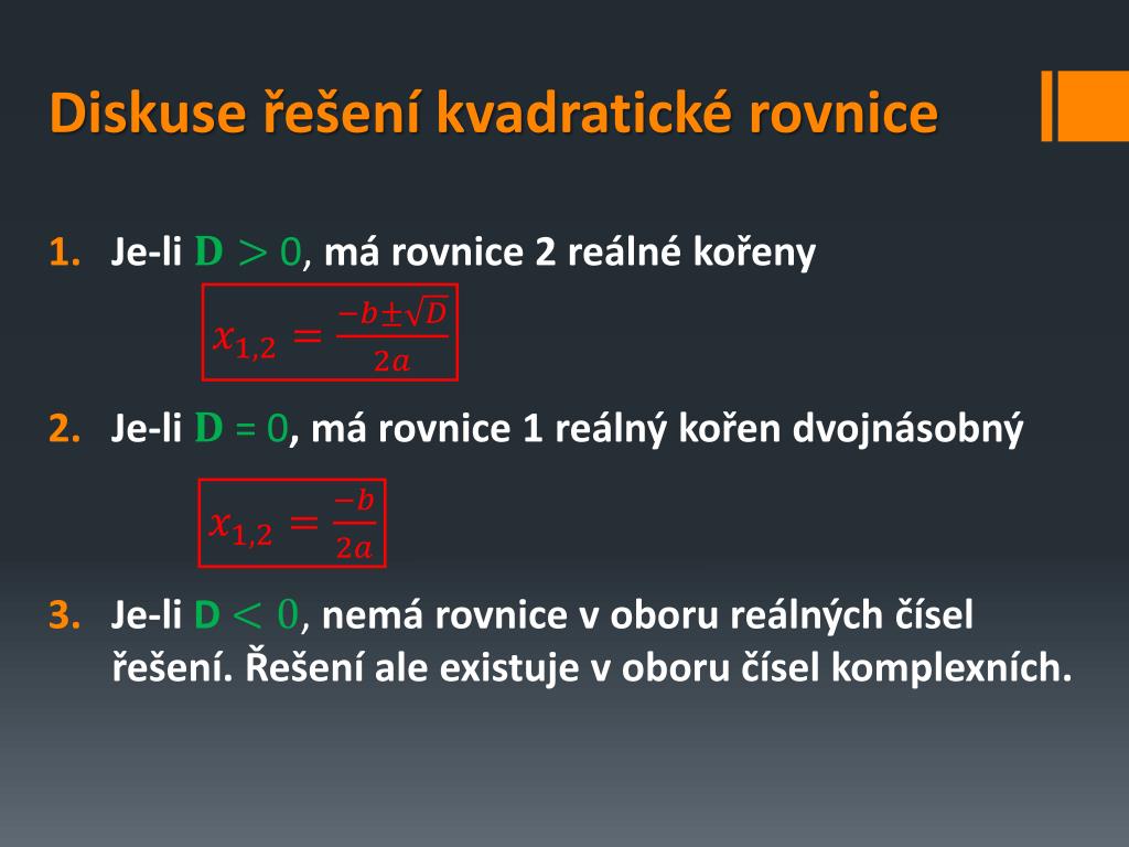 Diskuse řešení kvadratické rovnice Je-li 0, má rovnice 2 reálné kořeny Je-li = 0, má rovnice 1 reálný kořen dvojnásobný Je-li D , nemá rovnice v oboru reálných čísel řešení. Řešení ale existuje v oboru čísel komplexních.