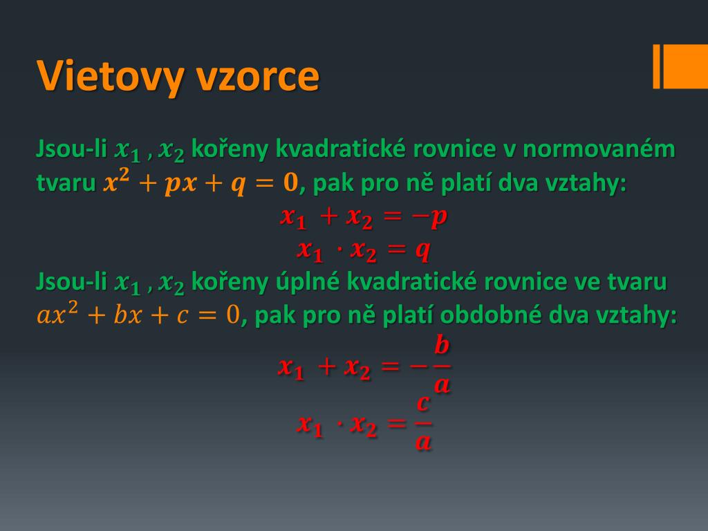 Vietovy vzorce Jsou-li kořeny kvadratické rovnice v normovaném tvaru, pak pro ně platí dva vztahy: Jsou-li kořeny úplné kvadratické rovnice ve tvaru , pak pro ně platí obdobné dva vztahy: