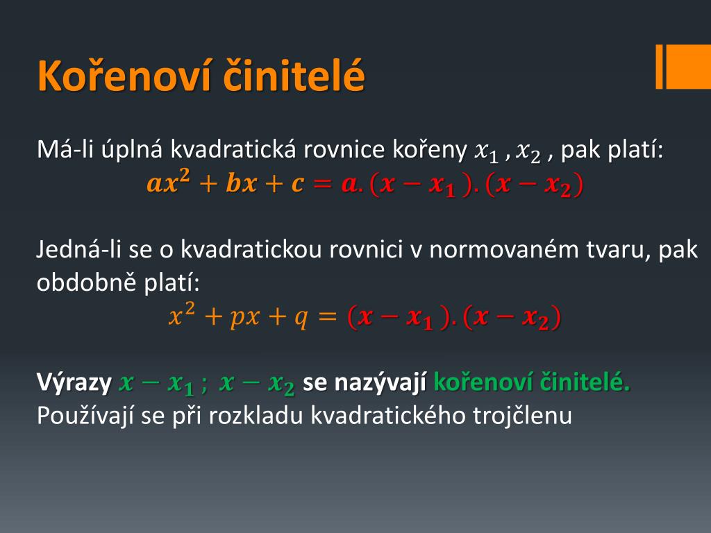 Kořenoví činitelé Má-li úplná kvadratická rovnice kořeny , pak platí: Jedná-li se o kvadratickou rovnici v normovaném tvaru, pak obdobně platí: Výrazy se nazývají kořenoví činitelé.Používají se při rozkladu kvadratického trojčlenu