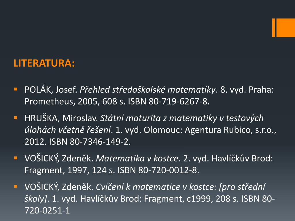 LITERATURA: • POLÁK, Josef. Přehled středoškolské matematiky. 8. vyd. Praha: Prometheus, 2005, 608 s. ISBN 80-719-6267-8. • HRUŠKA, Miroslav. Státní maturita z matematiky v testových úlohách včetně řešení. 1. vyd. Olomouc: Agentura Rubico, s.r.o., 2012. ISBN 80-7346-149-2. • VOŠICKÝ, Zdeněk. Matematika v kostce. 2. vyd. Havlíčkův Brod: Fragment, 1997, 124 s. ISBN 80-720-0012-8. • VOŠICKÝ, Zdeněk. Cvičení k matematice v kostce: [pro střední školy]. 1. vyd. Havlíčkův Brod: Fragment, c1999, 208 s. ISBN 80-720-0251-1