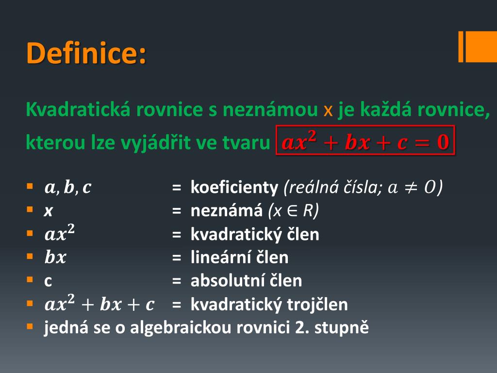 Definice: • Kvadratická rovnice s neznámouxje každá rovnice, kterou lze vyjádřit ve tvaru • = koeficienty (reálná čísla; ) • x = neznámá (x R) • = kvadratický člen • = lineární člen • c = absolutní člen • = kvadratický trojčlen • jedná se o algebraickou rovnici 2. stupně
