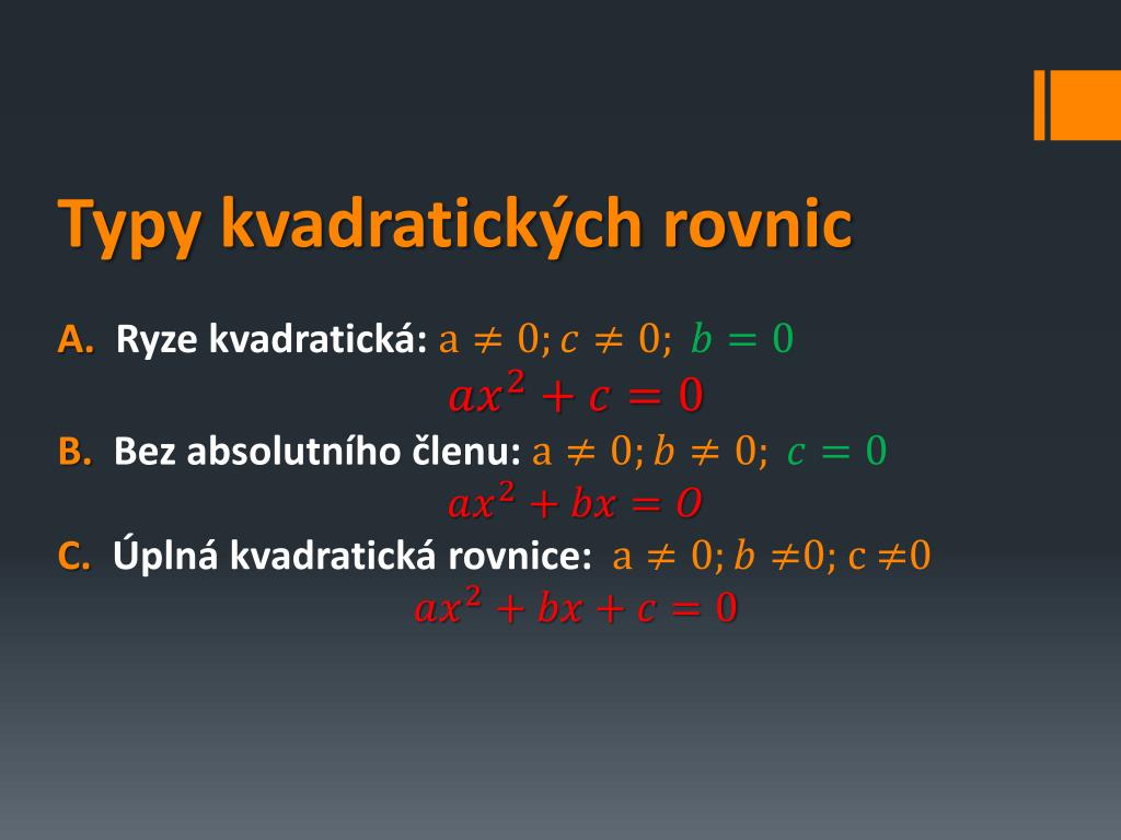 Typy kvadratických rovnic A. Ryze kvadratická: B. Bez absolutního členu: C. Úplná kvadratická rovnice:0; c 0