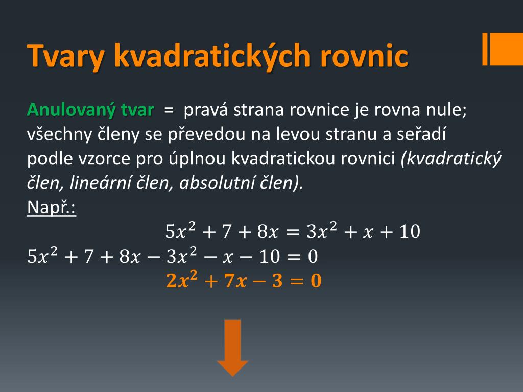 Tvary kvadratických rovnic Anulovaný tvar = pravá strana rovnice je rovna nule; všechny členy se převedou na levou stranu a seřadípodle vzorce pro úplnou kvadratickou rovnici (kvadratický člen, lineární člen, absolutní člen). Např.: